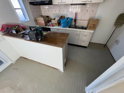 【内装施工事例】複雑なキッチン床にも対応!長尺シート転写施工で美しく仕上げました