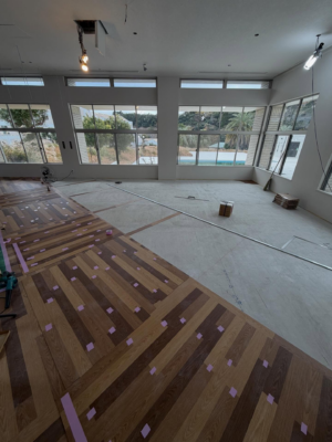 ▲床材施工中の様子。目地のずれが出ないようミリ単位で調整。