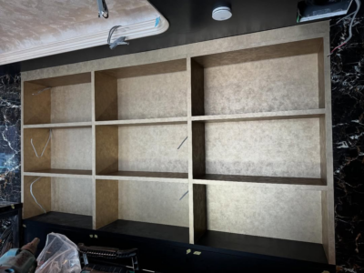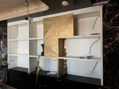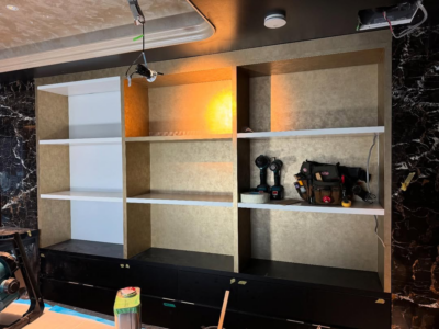 今回は、黒のカウンターに設置された**壁面の造作什器(収納棚)**に対し、以下の手順でシート施工を実施しました。