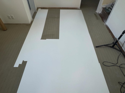 下地処理と接着剤の塗布を行い、転写で得た型に沿って長尺シートを丁寧に敷き込んでいきます。